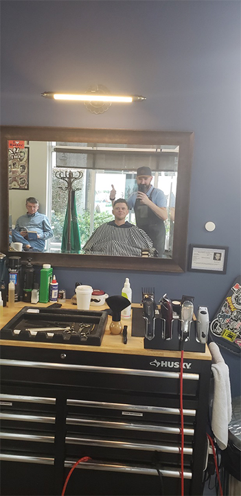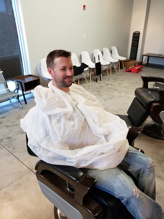 With construction almost complete, it was time to christen the shop with its first client – Andrew was indispensible to the buildout so it was only fitting he was the first one to get a cut in the new shop! – pay no attention to the trash bag chair cloth lol –
